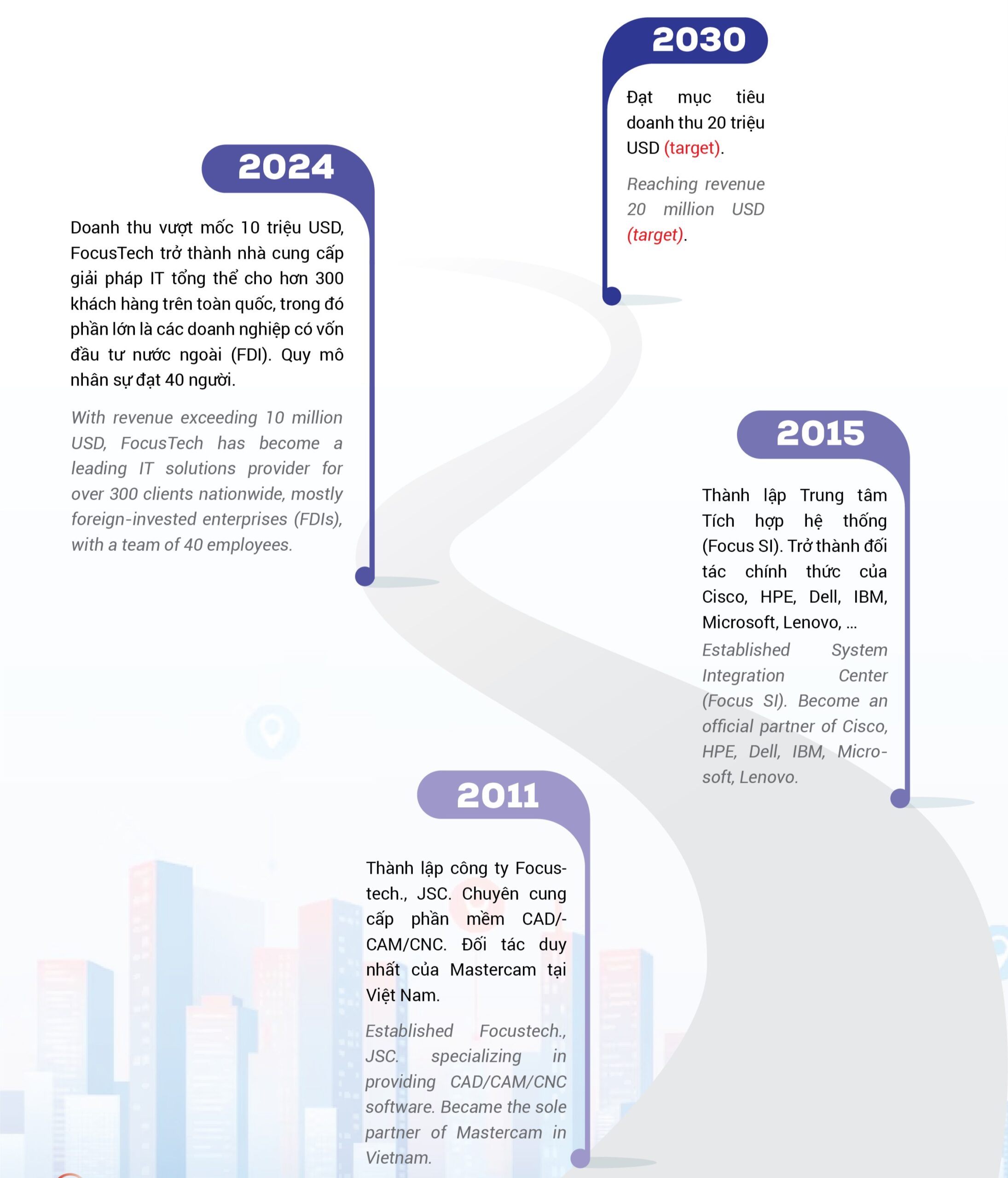 Thành lập từ tháng 3 năm 2011 tại Hà Nội, Focustech., JSC đã chọn cho mình sứ mệnh truyền tải những ứng dụng công nghệ tiên tiến nhằm đem lại giải pháp vận hành doanh nghiệp hiệu quả cho khách hàng. Qua đó, công ty đóng góp vào sự phát triển của Việt Nam. Sau chặng đường gần 10 năm phát triển, Focustech thật sự tin rằng lợi nhuận của công ty được tạo ra từ chính những giá trị mà chúng tôi mang đến cho khách hàng.
